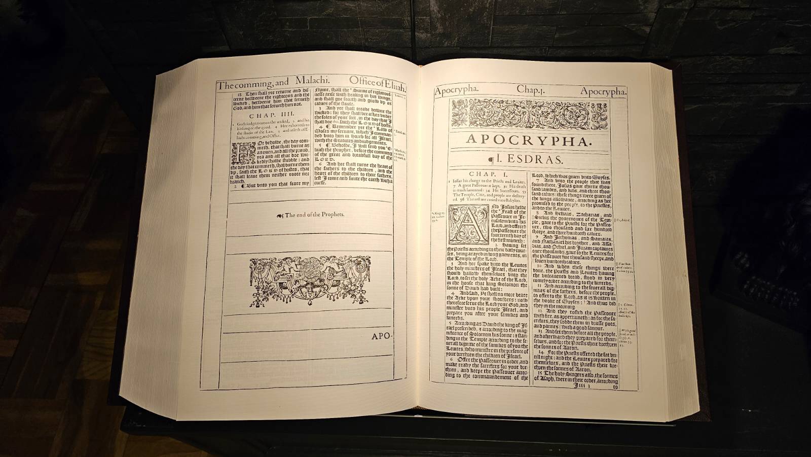 När KJV trycktes 1611 inkluderades Apokryferna – men under en särskild sektion mellan Gamla och Nya testamentet, tydligt märkta med rubriken Apocrypha. På varje sida stod ordet Apocrypha två gånger, för att visa att dessa böcker inte var kanoniska.